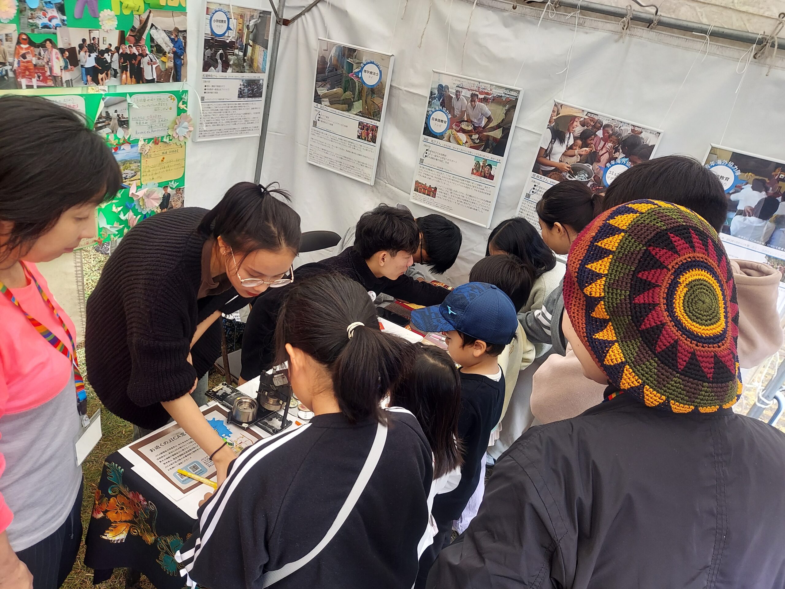翌日の2日目はあいにくの雨模様。しかし所々晴れ間も見え、多くの来場者で会場はいっぱいでした。実習生はJICA様のブースにて、来訪者のオリジナル缶バッジ作成のお手伝い。日本人のお子様相手にもしっかり対応し、普段の講習では見られない実習生の姿にスタッフ一同感心すると同時に、実習生の成長を間近で感じた時間でした。