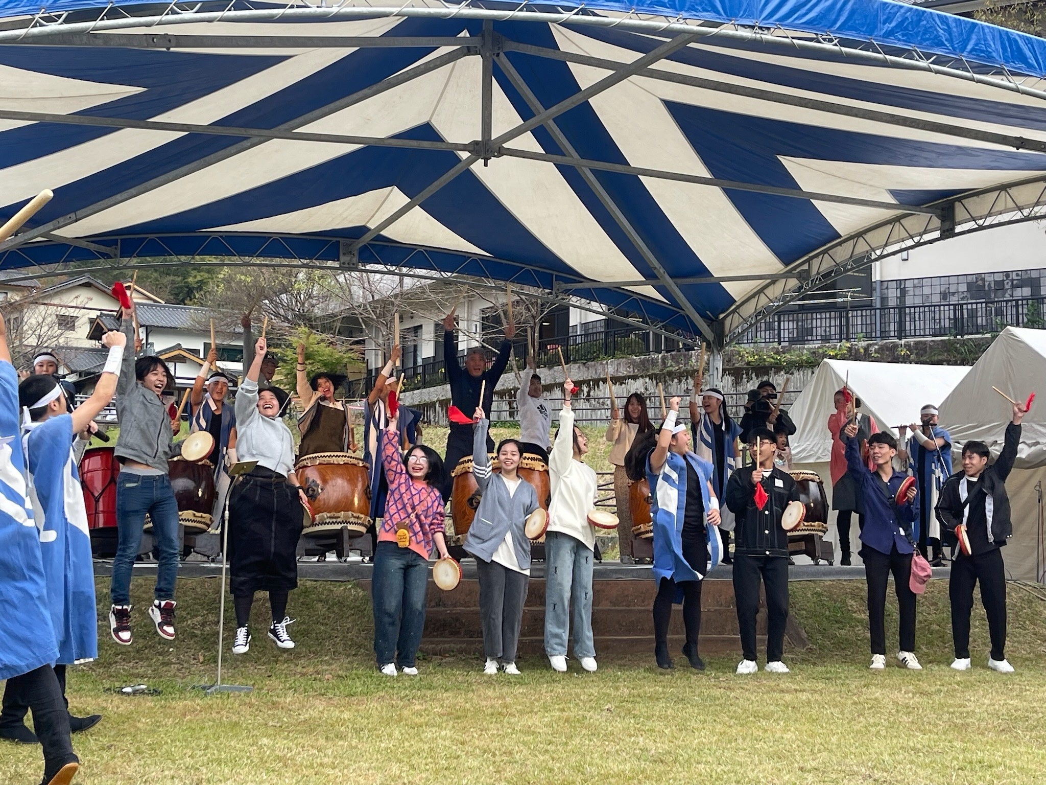 五木村伝統の子守歌の披露や餅つき等のステージイベントが行われる中、秀岳館高等学校の雅太鼓の演奏では、GMTにて入国後講習中の実習生も飛び入りで参加して会場を盛り上げました。初めは緊張していた実習生たちでしたが次第に太鼓のリズムをつかんでいき、見よう見まねで一緒に楽しんでいました。言葉は通じなくても一緒に楽しもうとする気持ちは共有できるものですね!