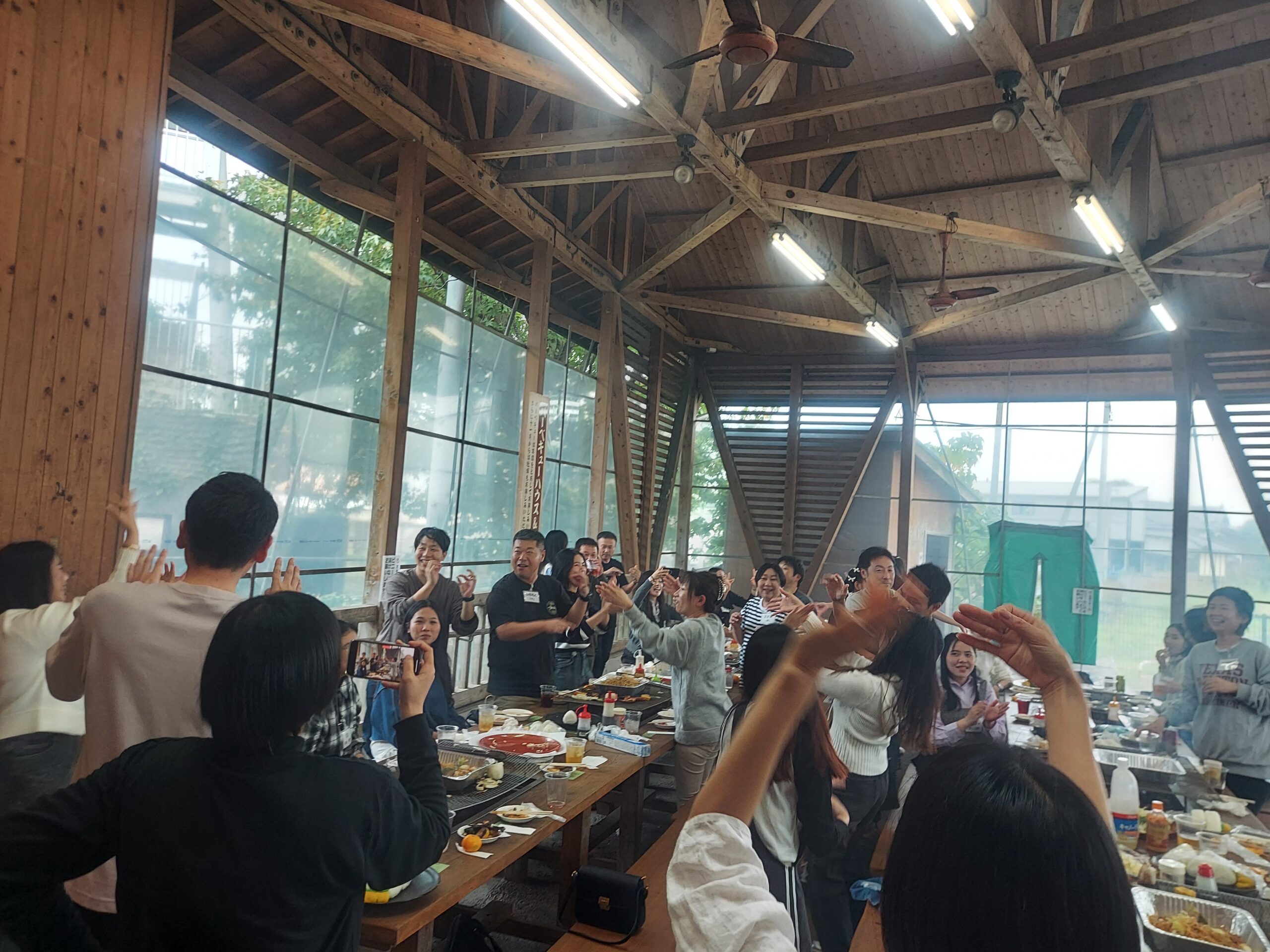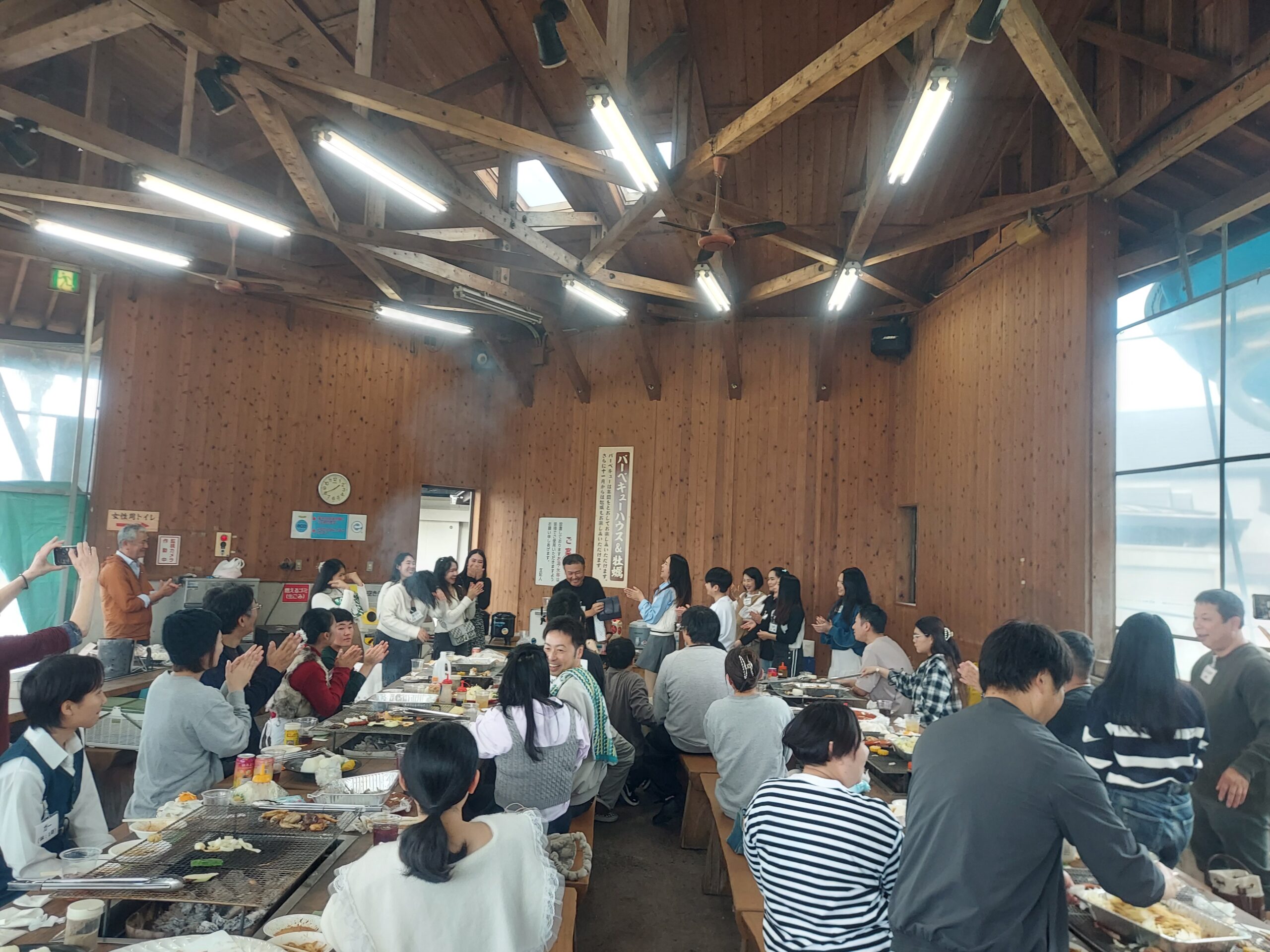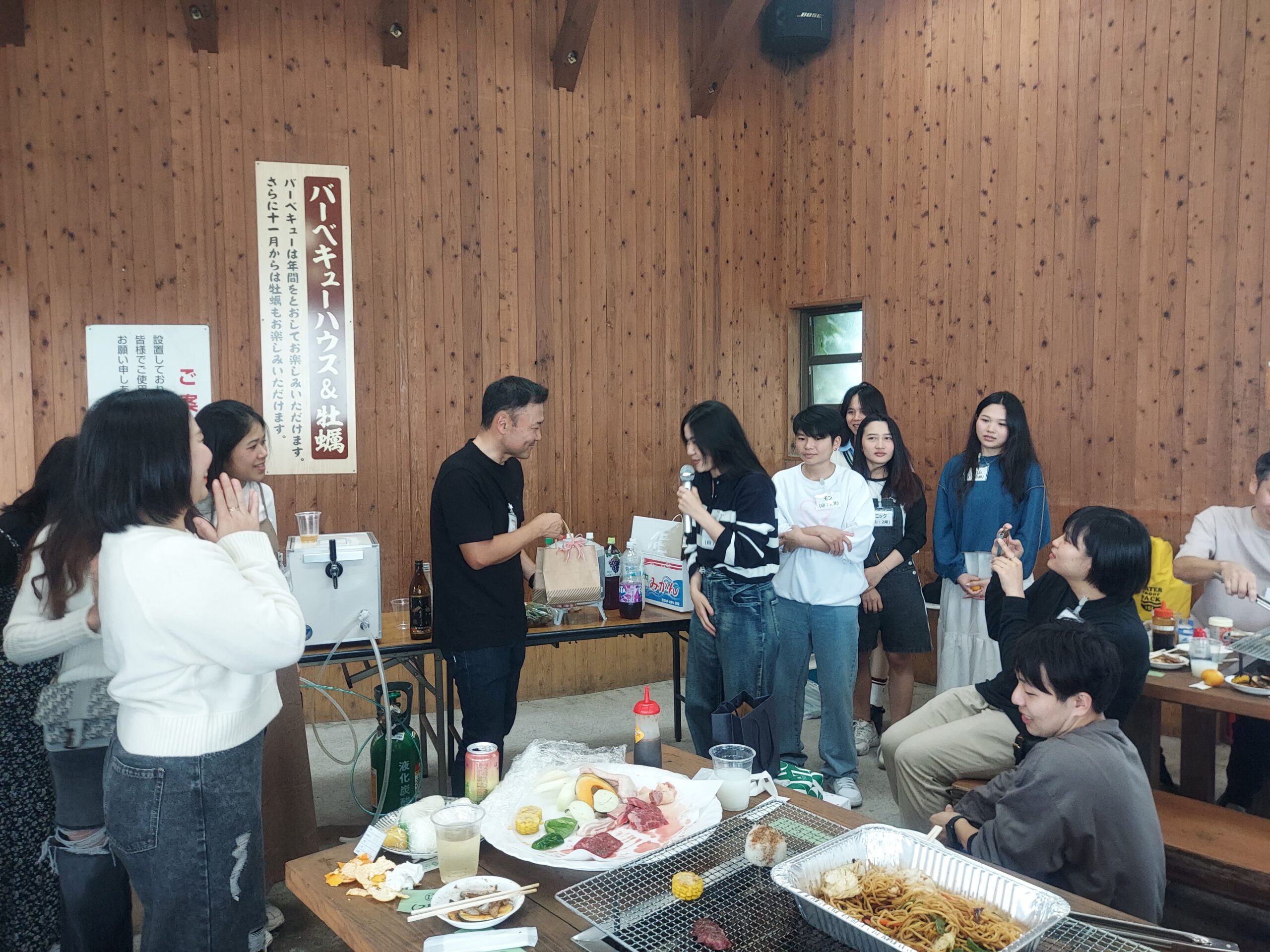 普段から料理をしている実習生達がほとんどで、手際よくお肉や野菜を焼いていきます。あいにくの雨模様でしたが、屋根付きの半屋外のスペースのおかげで快適に食事や交流を楽しむことが出来ました。